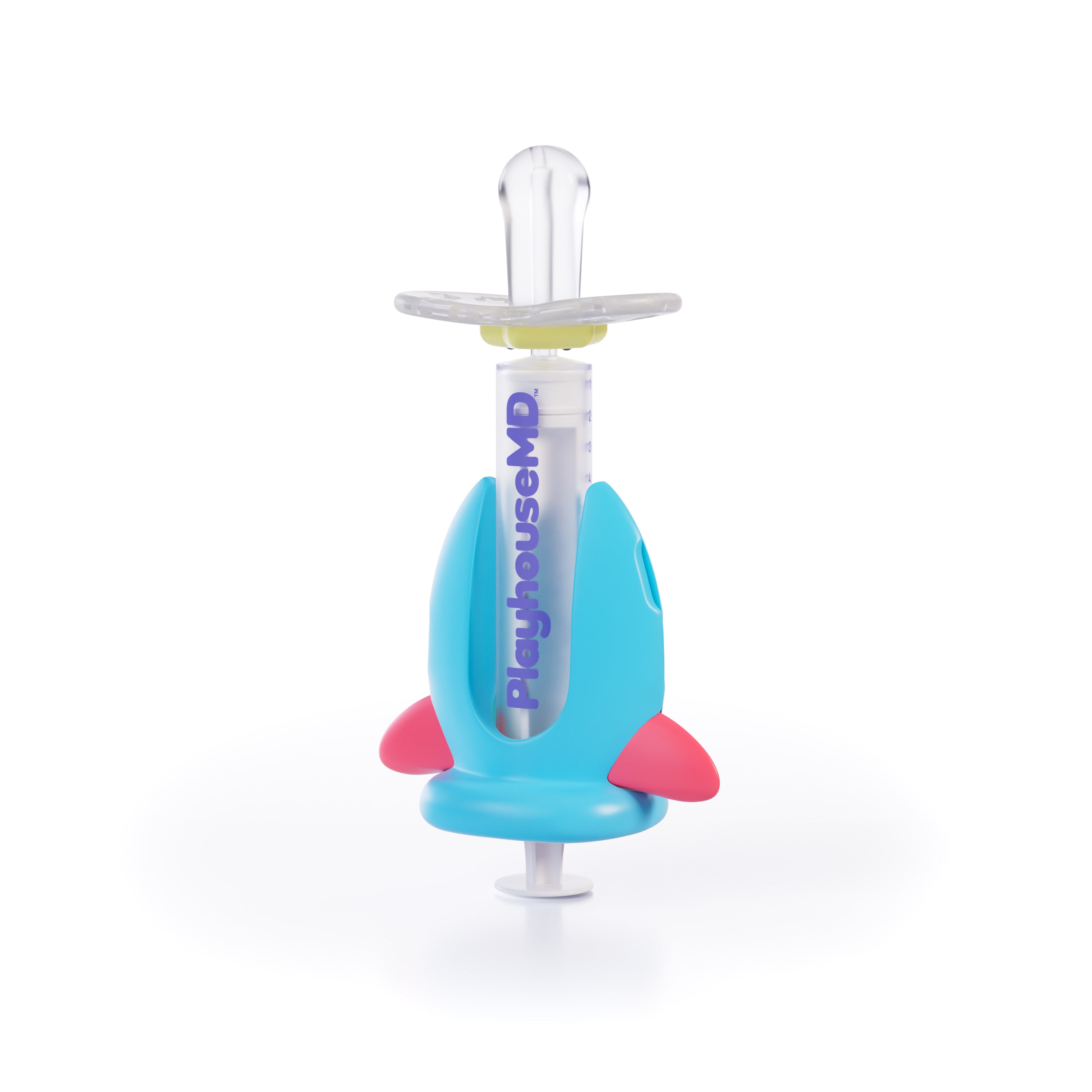 The Medicine Buddy uses a precise oral syringe with standard dosing markings to accurately measure and administer liquid medications. The rocket cover doesn’t interfere with the dosing process.