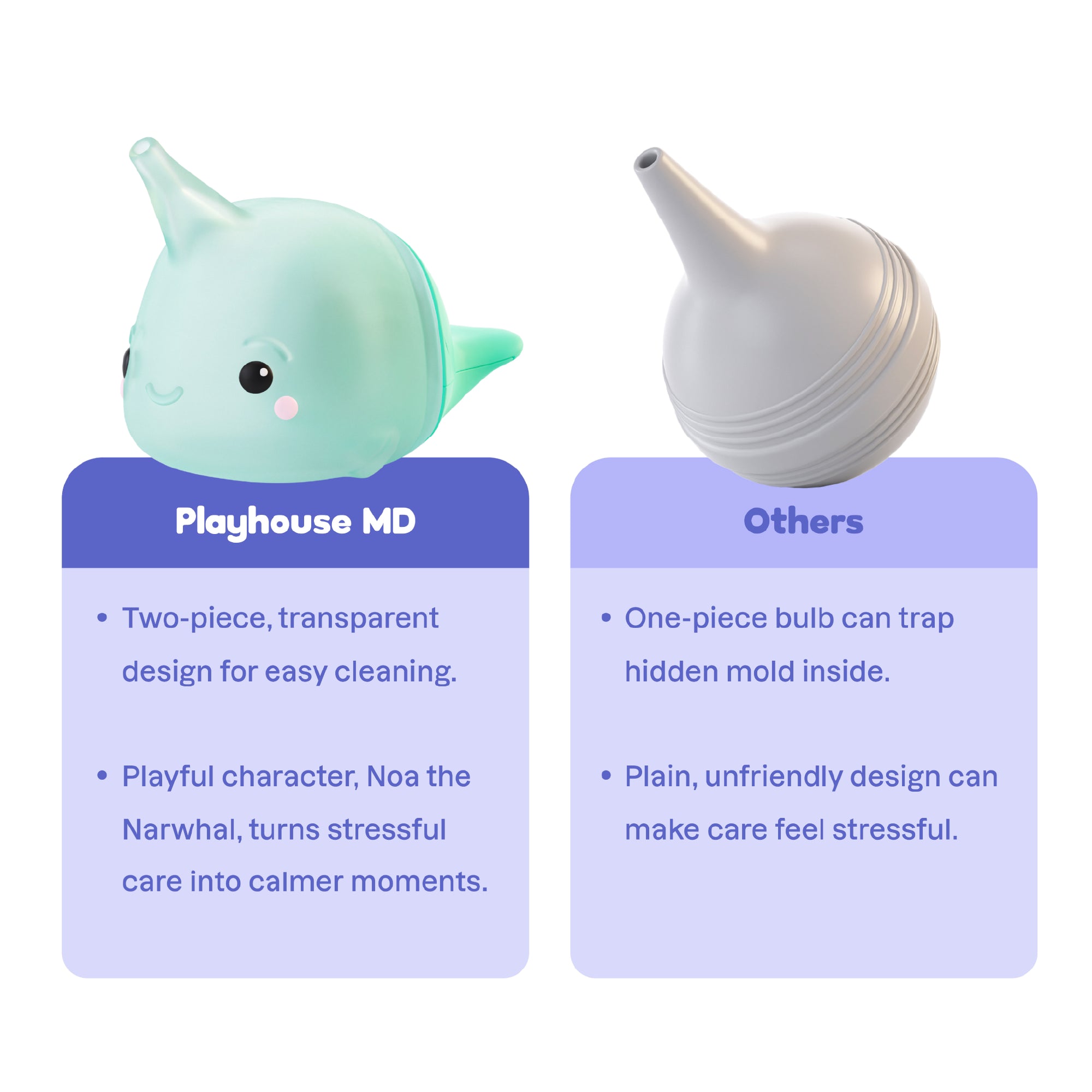 Meet Noa, the light-up nasal bulb for babies and toddlers designed to make sniffles simpler and care moments calmer. Doctor-designed and inspired by kids, Noa the Narwhal helps parents gently clear baby and toddler congestion with a soft, flexible tip made for tiny noses. The transparent silicone bulb and pull-apart design ensure easy cleaning with no hidden mold—because parent peace of mind matters. A soothing light guides nighttime care, while the playful character and story-led Playful Prompts Guide turn tough moments into positive bonding experiences for infants and toddlers 0M+.